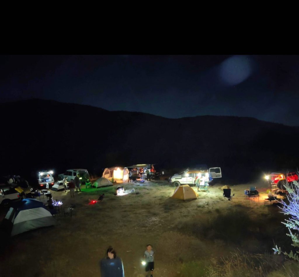 By 9:15 we made to camp, around 5 hours behind schedule. But that didn’t stop anyone to have a great evening preparing the best food I have had while on a trip (Filet Mignon with chimichurri sauce and crumbled blue cheeses and scallops, Korean kalbi, chips w/guacamole and salsa and carne asada, me Marinated Rib Eye steaks, cheese and meat platter, etc.) and then sit by the fire. 🌙
