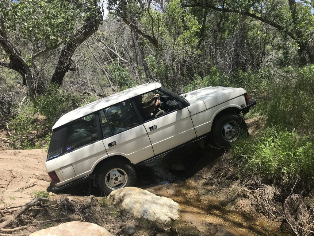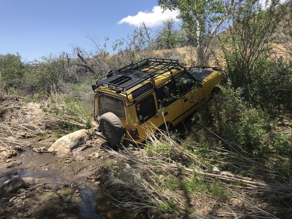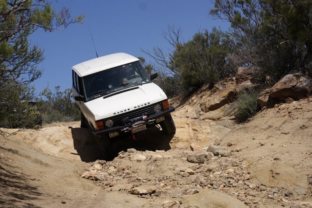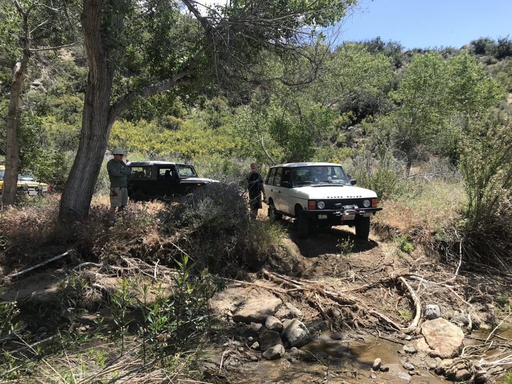 For the May trail we returned to the Beauty Mountain area north of Warner Springs. We met at Dudley’s at nine am: four trucks – club president Chris in his yellow Disco 1, board member Jerry (Range Rover Classic, tail gunner) who brought Christina to ride shotgun, Nick in his D90 and Gabriel and Lina leading the trail in their Range Rover Classic. After loading up on Dudley’s pastries and sandwiches, we headed north. A couple of miles past Warner Springs we turned into the hills on Puerta De La Cruz road. The first half of this road is paved, until you get to the Indian Flats campground. Pretty country with nice views down to Lake Henshaw and Palomar Mountain, blue skies and still some wildflowers.